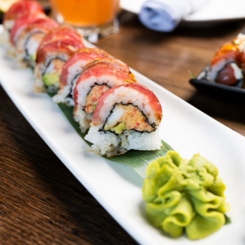 torched bluefin, avocado, daikon, carrots, wasabi aioli, crispy onions, spicy ponzu, kizami wasabi