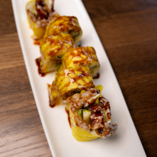 coconut shrimp, serrano, cucumber, cream cheese, avocado, mango, eel sauce, candied pecans, soy paper
