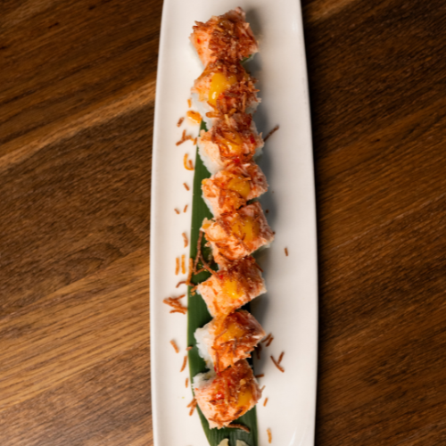 kimchi lobster, cucumber, avocado, bluefin toro, eel sauce, tobiko, tempura flakes